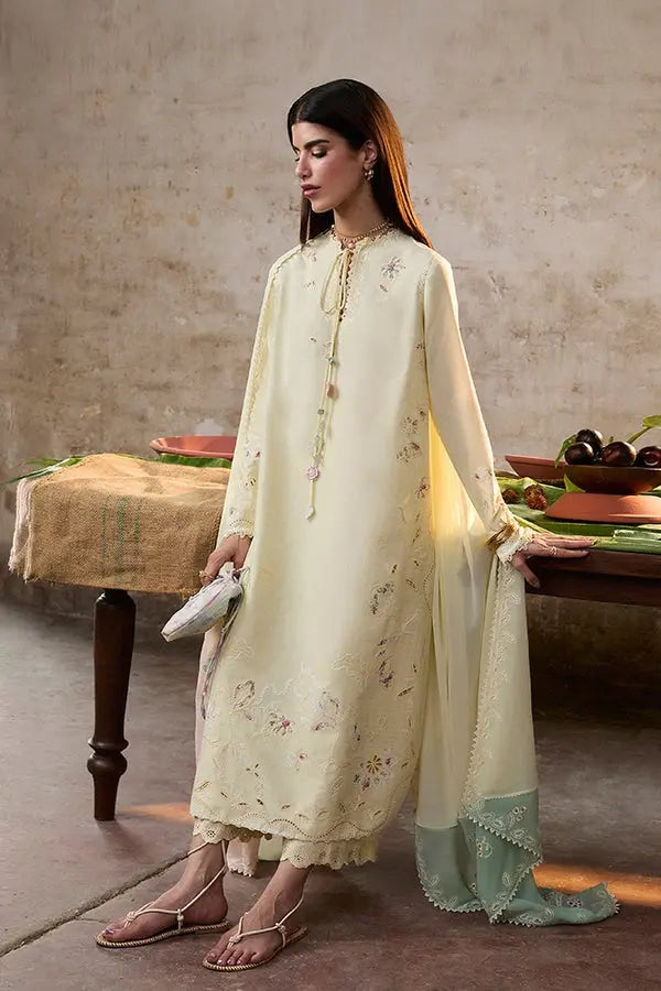 Gradient chiffon dupatta blending butter-yellow, pink, and green with embroidery accents and lace edging on all sides.