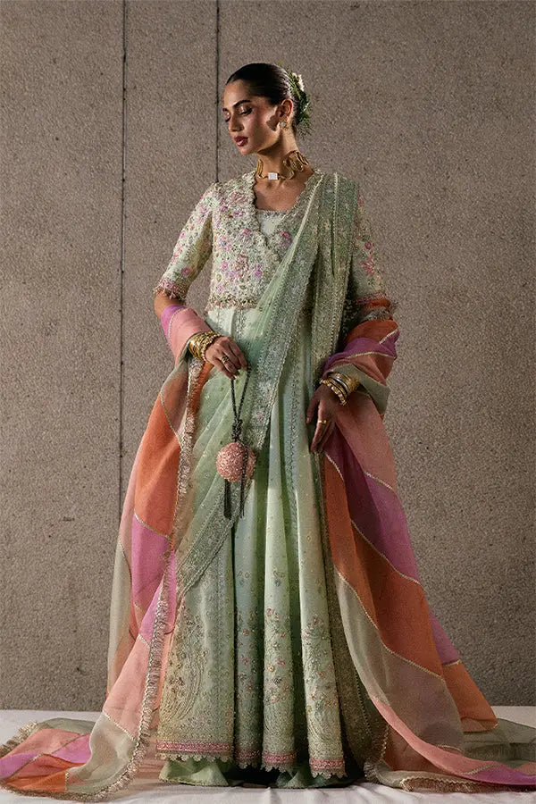 - An icy mint jacquard silk pishwas with scoop neck, lace‑detailed panels, embroidered hem, hot pink contrast borders; sleeve options: half or full, both embroidered with tassels (half ends at elbow; full covers arm).