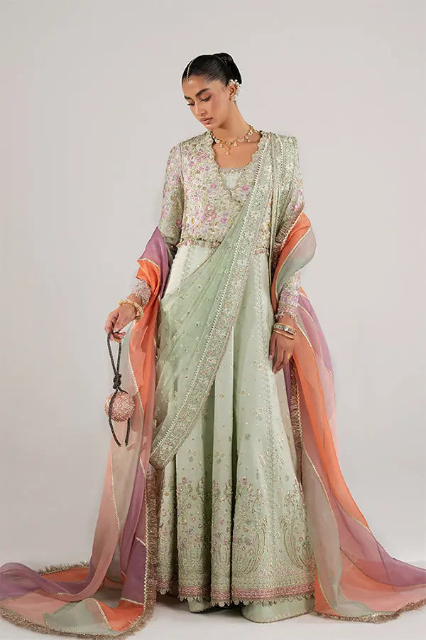 - Double‑drape net dupatta with embroidered borders and mesh spray in middle layer— versatile to style across or to side.