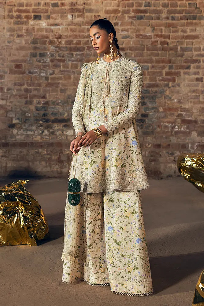 - The pants are sharara-style, made from silk, and feature a printed design.